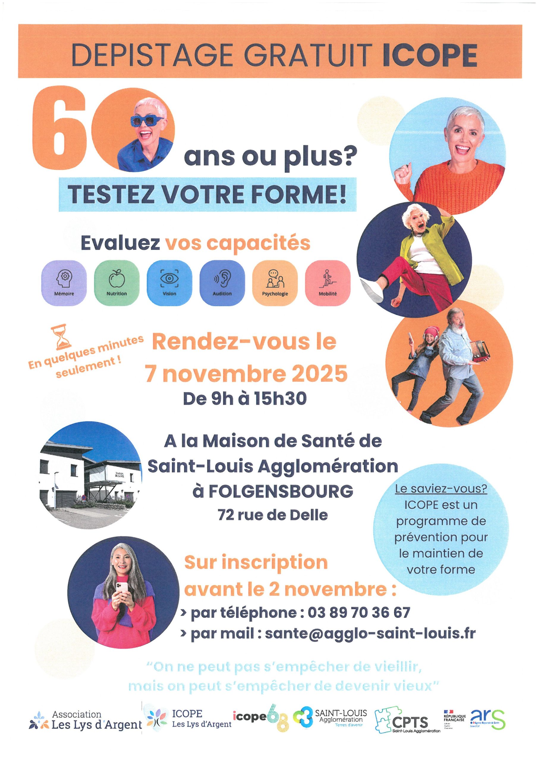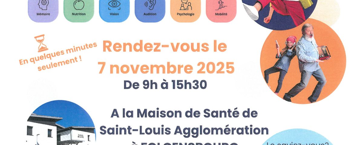 Dans le cadre du déploiement du programme ICOPE et en partenariat avec le Centre de Ressources Territoriales, une journée de dépistage est organisée à la maison de santé de Saint-Louis Agglomération à Folgensbourg le vendredi 7 novembre 2025.